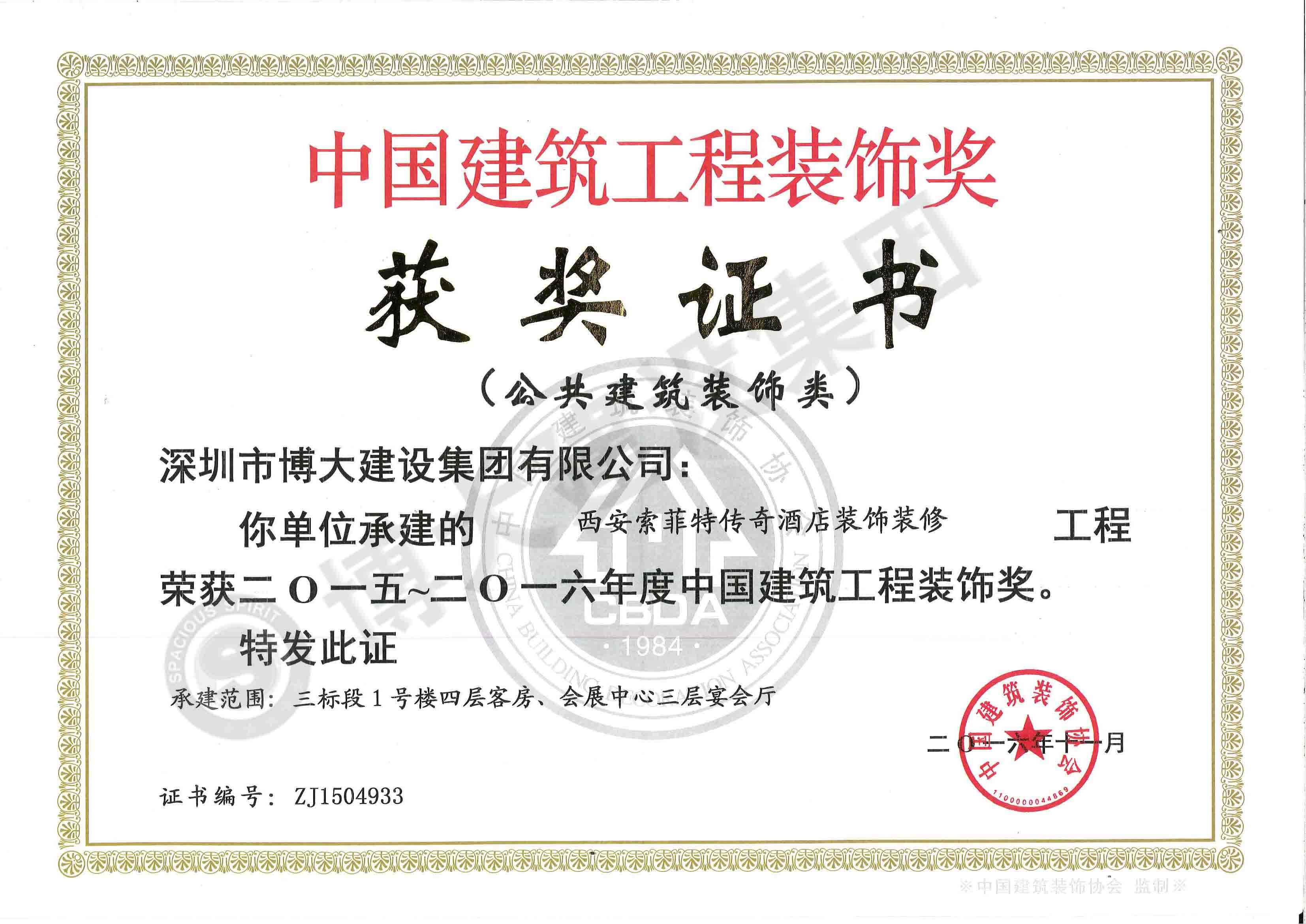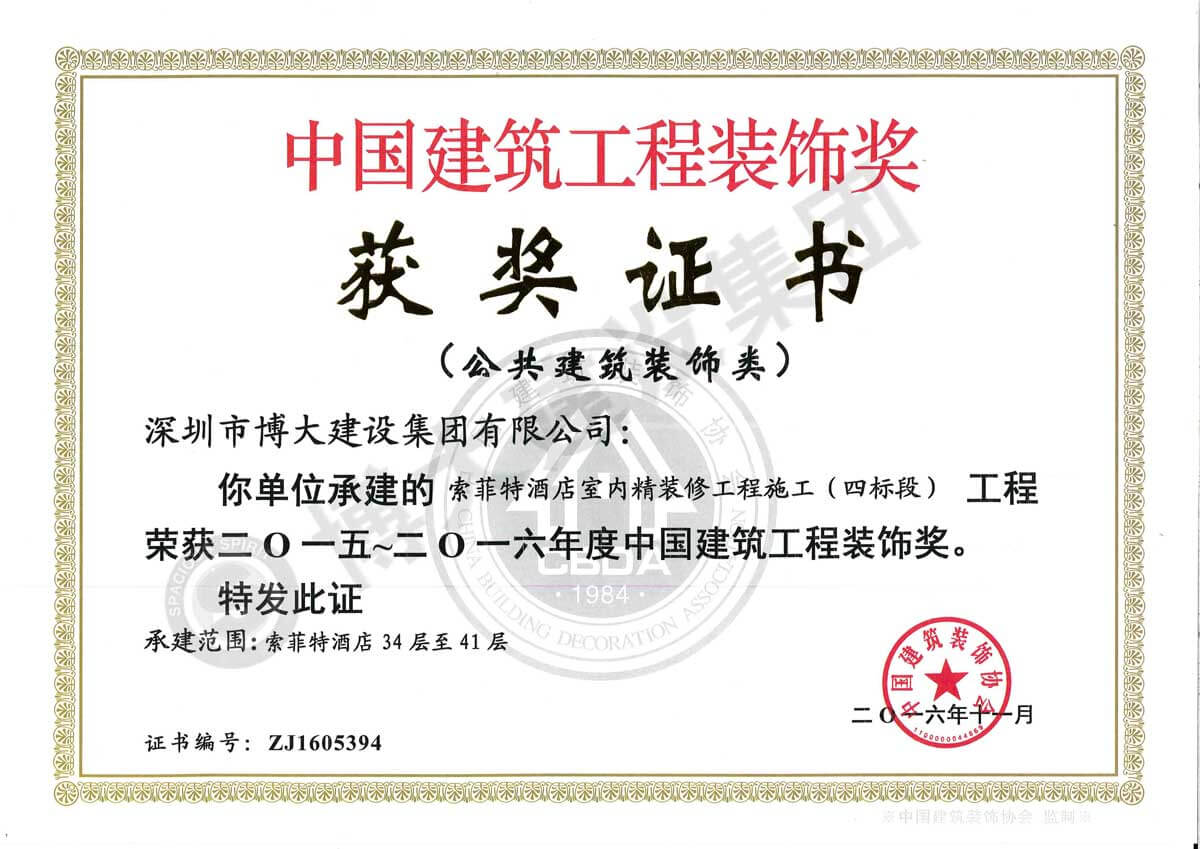 中國建筑工程裝飾獎(索菲特酒店室內精裝修工程-裝飾)