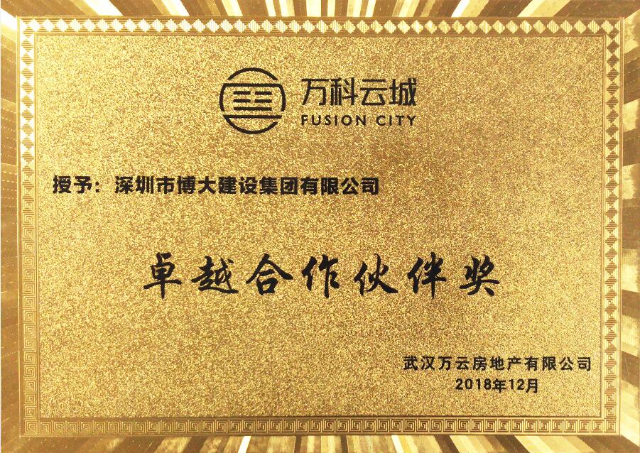 博大建設集團承建了禹洲集團湖北公司武漢賽洛城六期的精裝房工程,在武漢百盤維權的背景下,博大負責的精裝房一次性交房率達到98.41%,且工程質量優秀,幫助客戶成功避免了因交期、裝修質量而造成的消費者維權風波。博大的綜合實力和用心服務贏得禹洲集團湖北公司的高度認可,榮獲2018年度優秀合作獎。