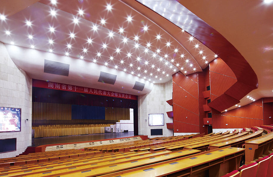 湖南省人民會堂是湖南省召開兩會和重要會議及演出的會堂,位于長沙市天心區湖南省人民政府新機關大院內西北面,總用地面積66333㎡,總建筑面積27000㎡,觀眾廳設座位1840席,主臺設座位200席。